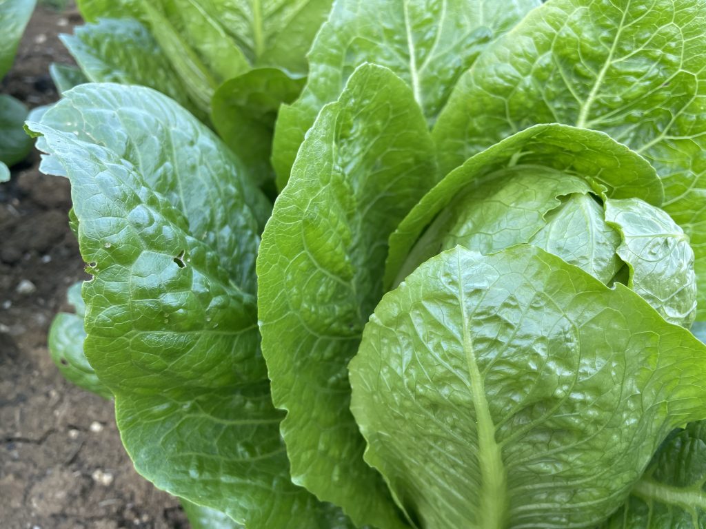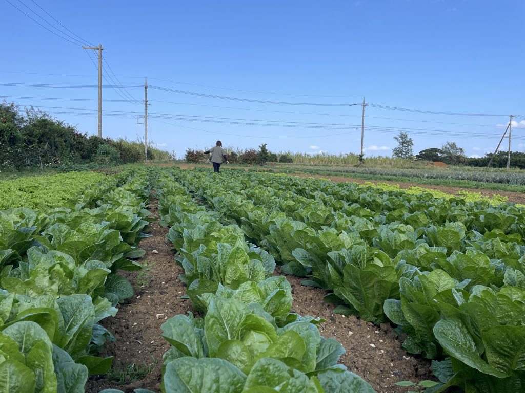 宮古島の青い空の下、幸せなエネルギーが循環して育つこの元気なロメインレタスを見てください!
