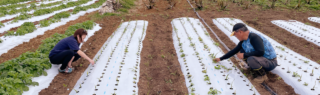 にんにく・玉ねぎ・ヨモギ・苺・ゴーヤー・ジャガイモ・シカクマメ・きゅうり・トマト・島ラッキョウ・マンゴー等々、手がける野菜やフルーツは多岐にわたります。