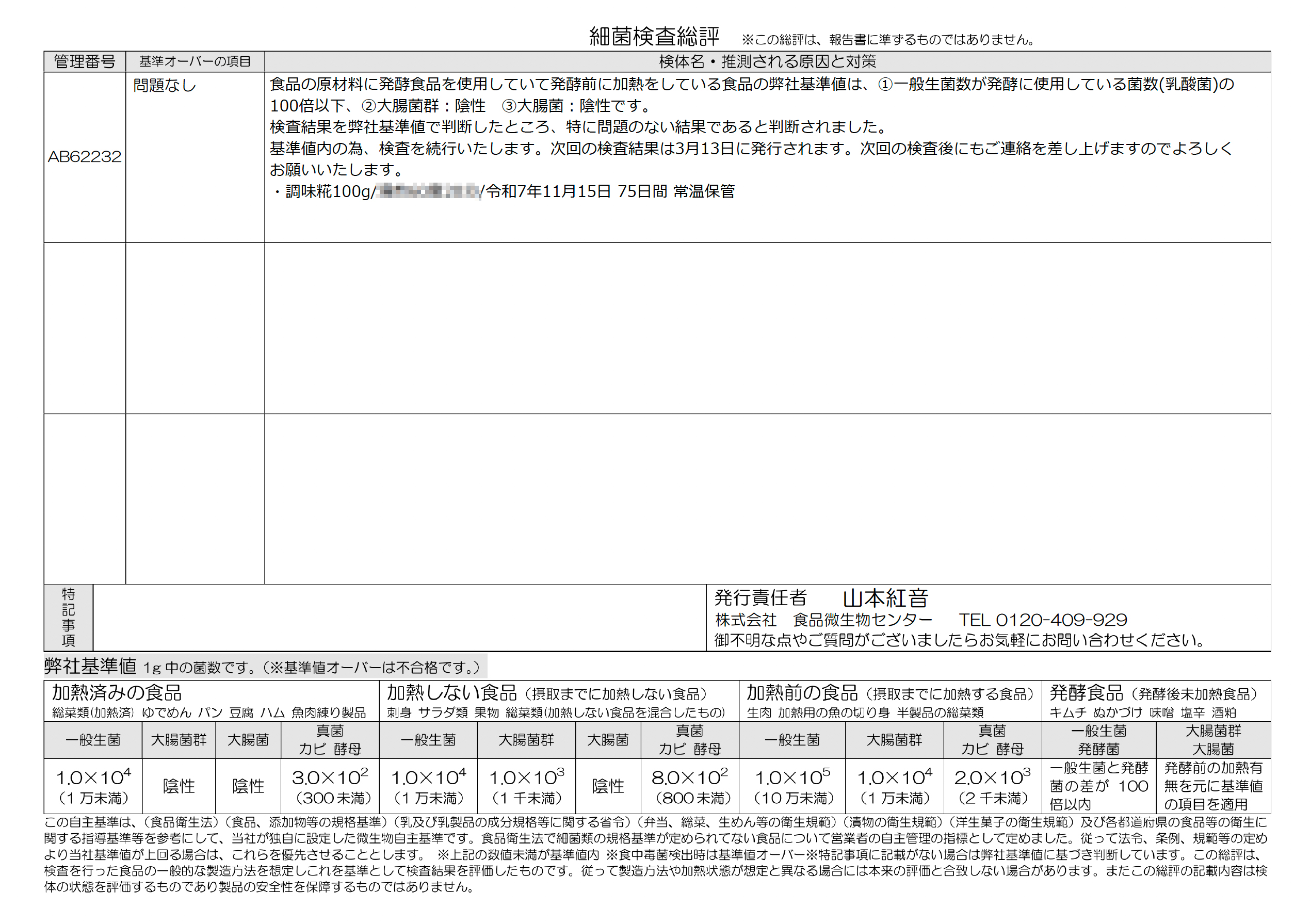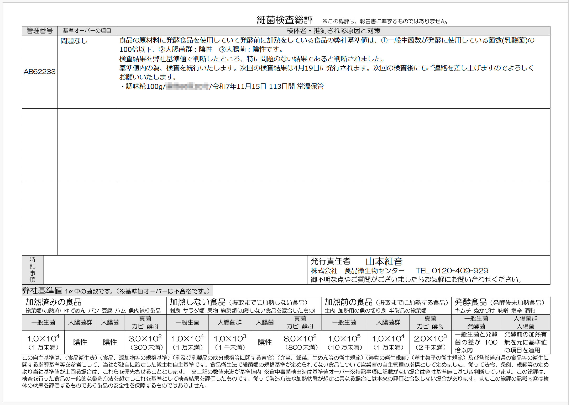 報告:大腸菌群・大腸菌等は陰性。一般生菌も発酵食品の基準値内であり、安全性が確認されています。