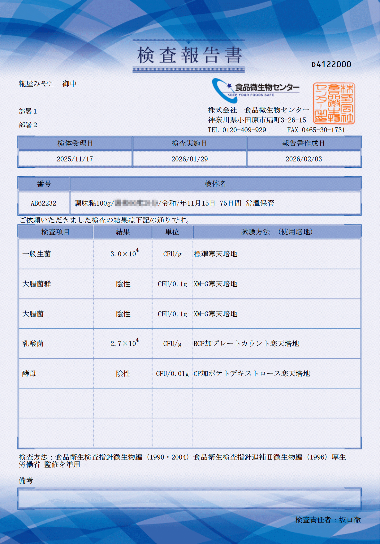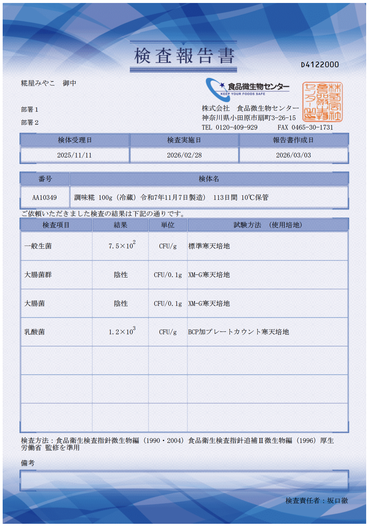 糀屋みやこが製造する麹食品を安心・安全に楽しんで頂く為に、定期的に検査機関を通して安全性の確認を行なっております。
